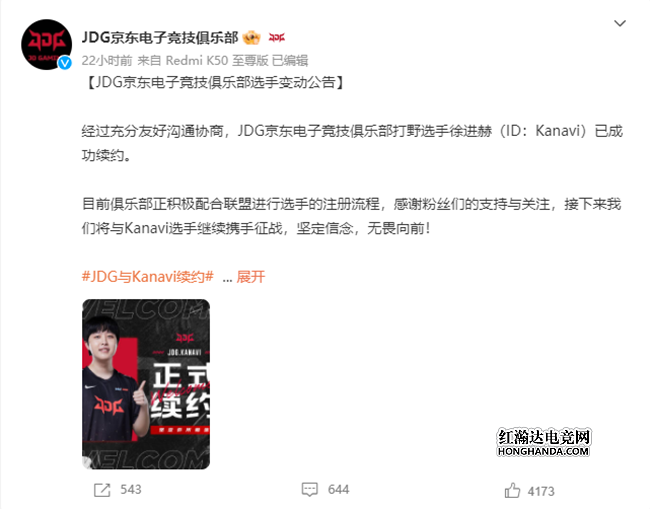 经过充分友好沟通协商,JDG京东电子竞技俱乐部打野选手徐进赫(ID:Kanavi)已成功续约。