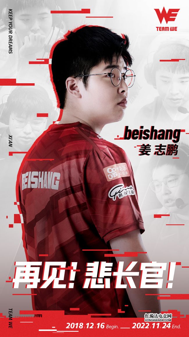WE.beishang(姜志鹏),于2018年12月以自由人身份加入西安曲江WE电子竞技俱乐部英雄联盟分部担任打野位置选手。入队以后,凭借自身灵性的打野思路以及极具入侵性的战术打法,尽露锋芒,入选2021春季赛常规赛第三最佳阵容打野,同年获得年度最佳打野提名。在队期间,协助团队取得了2020德玛西亚杯亚军,2021LPL夏季赛季军,2021NEST亚军等成绩。