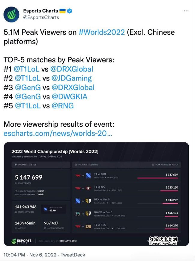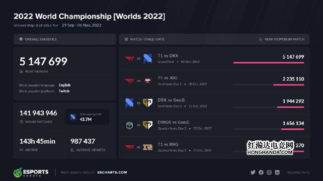 2022全球总决赛已于北京时间11月6日结束,LCK四号种子DRX以3-2击败LCK二号种子T1问鼎桂冠!近日国外数据统计网站Esports Charts更新推特,公布了S12观赛数据:决赛的海外观赛人数峰值超过了514万,观赛人数峰值前五的比赛T1独占三席。