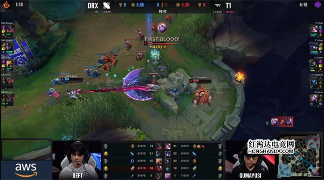 陷入绝境的DRX这一场的攻势相当凌厉,下路组升到3级先手对拼,不过烈娜塔的闪现Q落空,T1下路组果断反打,双方四人交出八个召唤师技能,一番“神仙拉扯”后Keria的索拉卡拿到Deft韦鲁斯的一血。