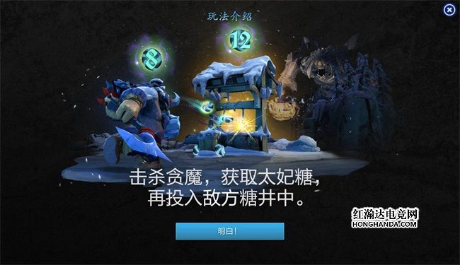 参与霜庆,利用肉山的力量摧毁敌方队伍的全部糖果井,贪魔偷走了肉山的糖果。玩家们需要攻击他们找回糖果后把糖果扔到敌方糖果井中。每一轮后肉山都会摧毁太妃糖最多的糖果井,率先失去全部4座糖果井的队伍将会失败,玩家还可以选择忠实的冬日坐骑来帮助穿过冰原,你会选择企鹅、食人魔海豹、雪球还是冰霜蟾蜍?