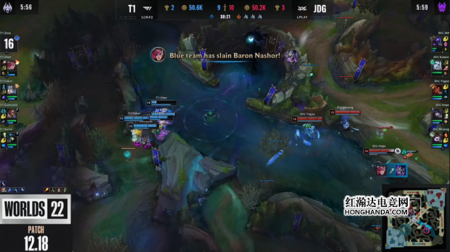 2022英雄联盟全球总决赛半决赛首场对决由LPL冠军JDG战队对上全球总决赛三冠王T1战队!胜者将获得第一张晋级S12决赛的门票。T1战队在先负一局的情况下凭借全员神勇的发挥连追三局,让一追三3-1淘汰了LPL的最后希望JDG战队,时隔五年再度杀入全球总决赛冠亚决赛。LCK赛区即将在决赛上演内战,提前锁定了S12冠军荣誉。