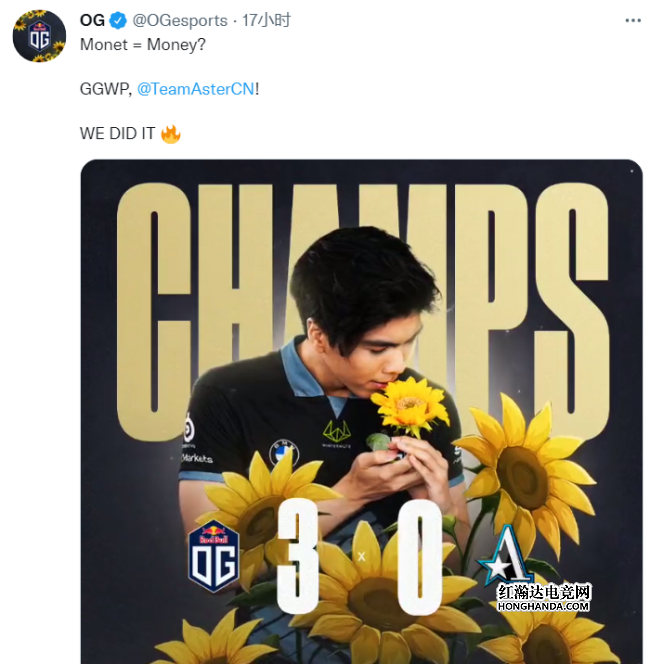 早些时候在阿灵顿Major上,Aster淘汰OG后皮球公屏打出ATF=ATM。这笔账在昨天ESL ONE马来西亚上被OG还了回来。总决赛OG势如破竹干净利落3-0送走Aster斩获冠军,赛后OG官推回应Monet=Money?