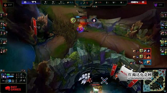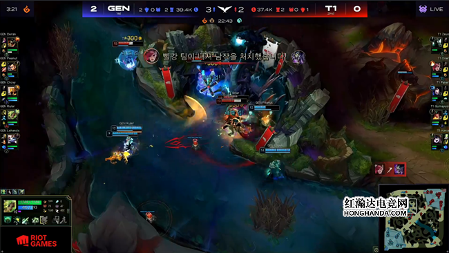 意外丢掉大龙没有对局势产生更多的影响,GEN继续执行控制小龙的战术,稳稳拿到听牌龙,T1在中路尝试强开泽丽但是打成了2换1。32分钟T1逼退GEN以后阻止对方拿到火龙魂,但GEN迅速转向上半区开始大龙逼团,铁男心急TP河道结果遭到击杀,GEN拿下大龙以后反手将前来干扰的T1众将悉数团灭。接下来GEN势不可挡强势推进中路,任何人都无法阻止他们冲向自己的首座联赛冠军,纵使是十冠王T1也倒在了他们面前,恭喜GEN 3:0战胜T1夺得2022LCK夏季总冠军!