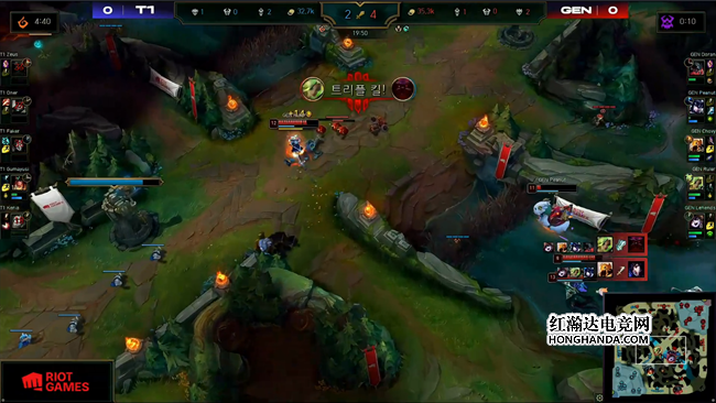 GEN刚刚拿下大龙Buff准备展开推进,猴子就在中路F6附近绕后开团秒掉了最关键的泽丽。虽然GEN也在野区抓死了阿木木,但是他们的推进也被迫减缓。GEN沉着冷静继续稳健运营,牢牢把握住之前团战积累下来的优势,保持着4千左右的经济领先。T1利用大龙引诱击杀璐璐以后选择开打大龙。GEN四人在龙坑附近不紧不慢形成包夹之势,剑魔和猪妹进场吸引仇恨分割阵型,泽丽再次进入无解输出模式豪取四杀,只有猴子一人带着大龙Buff侥幸逃脱!