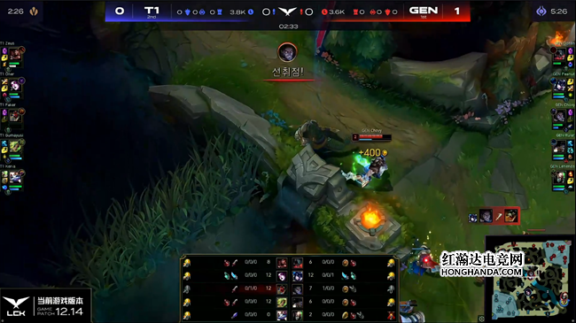 猪妹从三级就开始疯狂针对军训中路,连续将鳄鱼抓死两波。接下来炼金在下路闪现背摔留到泽丽,猪妹及时赶到断掉后路帮助尼菈砍下双杀,GEN中下两开花取得了巨大的对线优势。T1双人组游走中路却被猪妹的反蹲化解,反而是GEN野辅再次在中路打开突破口第三次击杀鳄鱼,塞拉斯还顺路前往上路协助剑魔拿下纳尔的人头,T1面对GEN的前期猛攻应接不暇濒临全线崩盘,短短12分钟已经落后了5千经济。GEN在取得优势以后的运营非常完美,牢牢掌控了场上所有战略资源。