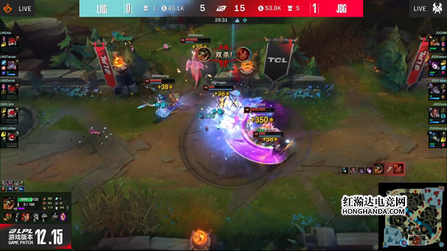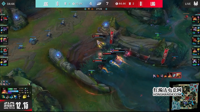 20分钟刚到JDG已经在LNG的上半野区布置视野,LNG殊死一搏开团终于击杀了JDG的中野,拿到了塞拉斯的1000块赏金,这波团战让JDG的攻势暂时放慢了下来,他们稳住阵脚巩固现有的经济优势,不再轻易地给LNG机会。28分钟两队为了一个红Buff在LNG的野区再度爆发团战,鳄鱼开大冲进人群一打四摧毁了LNG的防线,JDG队员跟上输出完成0换4击溃LNG,顺势回头拿下大龙Buff,经济领先超过一万块。