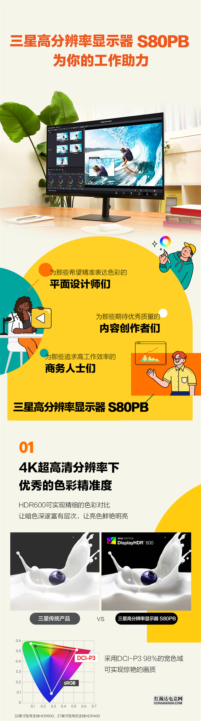 设计图稿的颜色经常有误差?阳光灯光的外界光线影响创作效率?三星高分辨率显示器系列为创意人士办公助力!精确色彩和亮度,避免失真影响创意呈现不受外界光线干扰,让灵感涌现同时人体工程学设计让你的创作环境更舒适还想了解更多?滑动查看下面信息图了解~