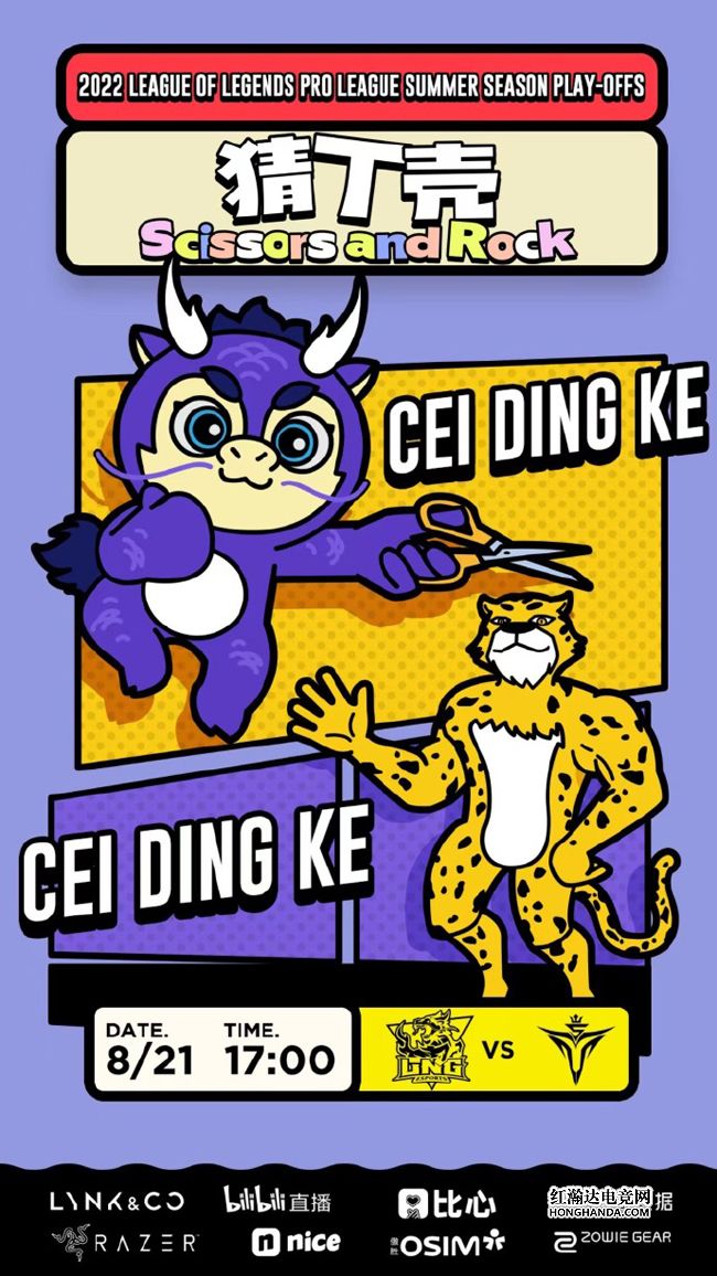 LNG的海报标题为“猜丁壳”,LNG的吉祥物小麒麟伸出的是剪刀,而V5的吉祥物黄豹伸出的却是手掌,毫无疑问LNG拿下了一分~LNG先后淘汰了BLG和WBG,并且比分都是3-1,其状态之火热可见一斑。虽然V5有90点全球总决赛积分,但也不能掉以轻心,毕竟晋级四强就拥有了“双败复活甲”,期待两队今晚的精彩博弈!