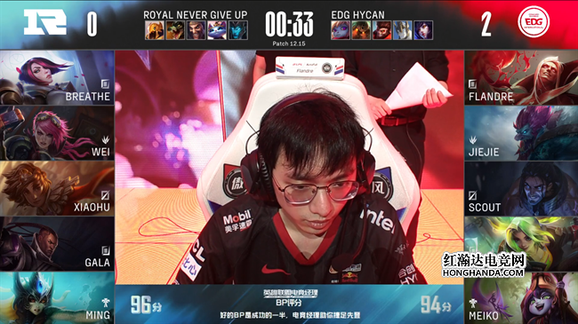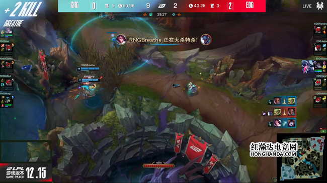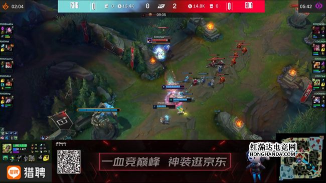 蔚前期Gank抓出吸血鬼闪现以后不依不饶又叫上岩雀前来越塔,成功拿下一血。接下来双方前期的节奏近展的比较缓慢,RNG围绕战略资源不断发起突袭,牢牢压制住了EDG,通过中野的控制链收割人头,慢慢地把经济优势扩大到5千块以上。23分钟EDG在下路河道主动先手打残了RNG的上中野,成功占据了龙坑位置,把RNG逼退以后拿到小龙,大大缓解了资源上的压力,为C位争取了更多发育的时间。