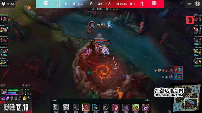 RNG的形势急转直下,开团点不足的劣势暴露了出来,EDG乘胜追击强势推进下路高地,果断的开团击溃了RNG的防线,随后一波推平基地结束了比赛。恭喜EDG再下一城2:0手握赛点,他们距离季后赛四强获得复活甲只有一步之遥。