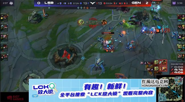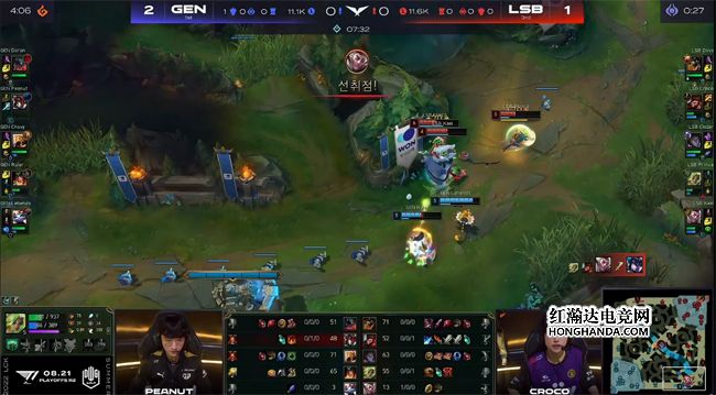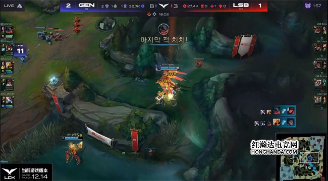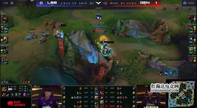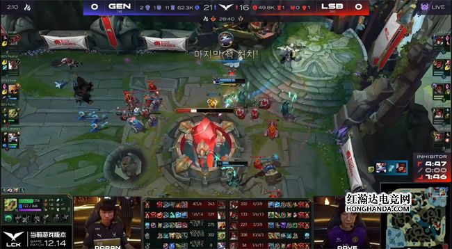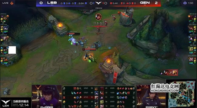 两队的风格跟LCK以往的“莎士比亚”局截然不同,前期罕见地进入“大乱斗”节奏,LSB在小龙河道打出0换3先声夺人,随后GEN在峡谷先锋河道打出2换4找回了场子。LSB众将的脾气相当火爆,复活之后即使塞拉斯在下路带线,LSB正面四人也要接先锋团战,GEN五打四“被迫反打”出一波0换4,控下第一只先锋加火龙,撞掉中路一血塔节奏起飞~LSB继续强势开团抓单,GEN中野辅陆续倒地,不过经济仍然领先4千。