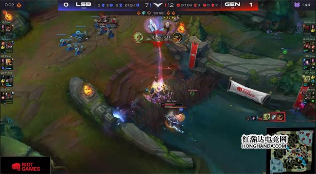 这一局前期GEN中、下两路手握线权,LSB只有鳄鱼在上路压制力剑魔,并且抢到了6级。7分钟猴子gank下路时被猪妹反蹲到,不过猪妹只有5级,猴子开大卷到GEN野辅,LSB下路组补伤害拿到猪妹的一血。