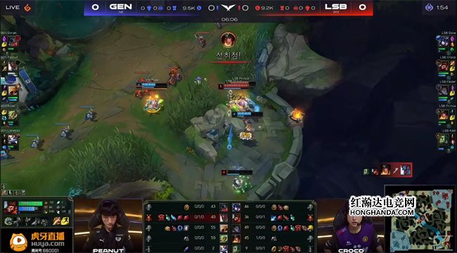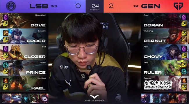 开局Peanut的猴子3级gank中路,沙皇只有2级无法位移,被迫交出闪现,不过LSB三路全部手握线权。6分钟猴子gank中路,Chovy的阿狸三连魅惑压低了沙皇的血量,并且留下了残血沙皇,帮助猴子拿到一血。