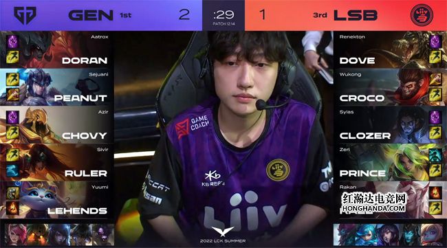 Dove的鳄鱼换线到下路又被GEN四人抓死,不过LSB“听牌”了火龙魂还能接受。大龙出生前GEN利用第二只先锋通关了下路,鳄鱼第五次阵亡发育炸穿,LSB经济落后3千。中期LSB抓住GEN必接龙魂团的心理,灵性决策rush掉大龙,不过在小龙河道开团时鳄鱼单切后排赶跑了泽丽,LSB正面却被GEN上野双大招反开,尼菈惨遭集火瞬间融化,GEN控下火龙打断了LSB的节奏。33分钟LSB在中路先行带走奥恩,Ruler的泽丽疯狂输出怒砍三杀,GEN得以打出1换3再控火龙!最终GEN在中路摧枯拉朽打出0换5团灭LSB一波结束比赛,2-0锁定了赛点!