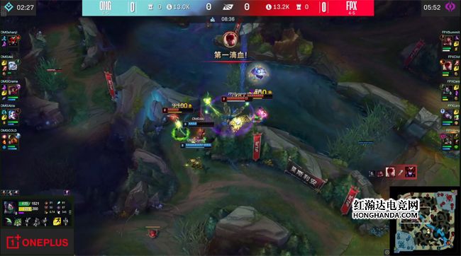 OMG上中野的前期战力稍胜一筹,所以盲僧前期的控图重点在下路。波比gank上路时打出了船长的闪现,FPX只能放掉峡谷先锋转而控下火龙,然后一波中野下路四包二得手,厄斐琉斯不慎吃到赛娜的W无奈阵亡。15分钟赛娜单吃了下路一血塔,作为交换OMG抱团拿到第二只先锋,利用前后两只先锋才推掉FPX中路一塔。大龙出生前OMG在下路河道先手开团,波比开大锤飞船长后阿卡丽两段R进场切死了塔姆,OMG打出2换3控下水龙,双方经济持平。
