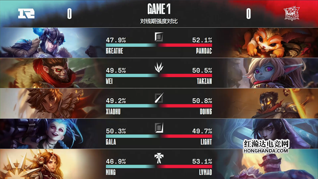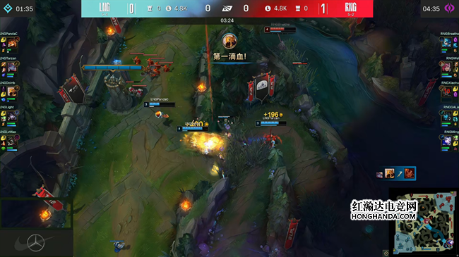 RNG开局强行入侵野区骚扰打出了纳尔的闪现,迫使对方TP回线,岩雀三级推线以后直接游走到上路准备越塔,不过LNG已经有所警觉,纳尔在塔后草丛放眼看到了岩雀,不过岩雀依然没有撤退的打算,LNG中野终于游走过来收下了岩雀的一血,接下来RNG的决策都非常的激进,给了LNG不少机会,尤其是岩雀太急于带动节奏,连续地被LNG当成突破口拿到人头,10分钟不到连续阵亡四次,让RNG的前期节奏受到了不小的影响。