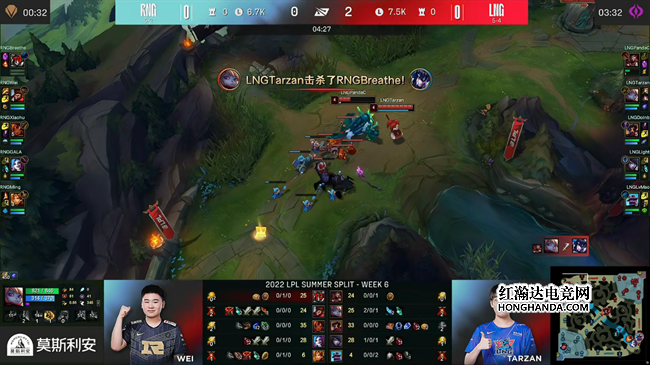 2022 LPL夏季赛常规赛第六周第五天,RNG战队对阵LNG战队,LNG战队派出了小将PandaC代替Ale担任首发上单。RNG战队在第一局通过中野辅前期的节奏联动轻取领先以后在第二局因为阵容和发挥的不稳定被LNG扳回一城,决胜局里RNG重新找回熟悉的运营节奏,通过环环相扣的进攻窒息压制拿下最终的胜利。
