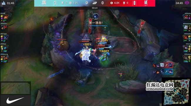 大龙出生前WE的第二只峡谷先锋没能撞掉上路一塔,JDG放掉先锋转而“听牌”了风龙魂,抱团对WE中路一塔施压,WE选择先手开团,卡莉丝塔依靠盾弓的被动护盾“锁血”逃走,JDG反打出0换4大获全胜,通关了WE中、下两路,经济领先9千。369的凯南在下路单带时埋伏在WE的野区,卡视野先手电晕纳尔,再接大招及火箭腰带完成了对位单杀!JDG正面果断开大龙逼团,打出1换4惩下大龙!虽然JDG推进中路高地时凯南闪现撞墙尴尬空大,但WE装备落后太多无力回天,JDG强势虐泉1换5团灭WE一波结束比赛,1-0先下一城!