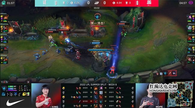 开局beishang的佛耶戈刷到3级入侵JDG的蓝buff野区,双方上中野爆发团战,虽然丽桑卓拿到了猪妹的一血,但佛耶戈变身成卑尔维斯后怒砍三杀,WE打出2换3完全不亏~