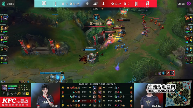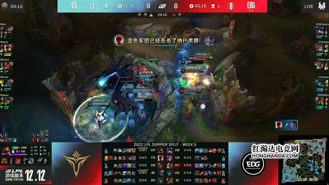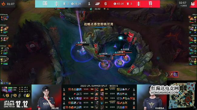 2022 LPL夏季赛常规赛第五周第七日,7战全胜的V5战队对阵世界冠军EDG战队,在两局比赛里V5全都选出了全部押宝前期的阵容,但在比赛里他们流畅的战术执行与严谨的团战配合硬生生将这套阵容的价值发挥到了极致,凭借无懈可击的团战发挥,V5 2:0战胜EDG,继续保持不败金身!