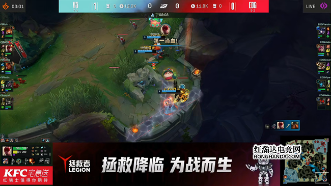 蔚前期的活动都被V5牢牢盯死,找不到什么做事的机会,还被盲僧入侵了野区,过的很不舒服,6分钟EDG集结四人想要控下第一条小龙,没想到V5同样大部队包夹过来,盲僧当面抢走了小龙,V5还想要尝试追击开团,不过伤害不足勉强击退了EDG没有拿到人头。盲僧前期依然非常活跃,先后在中下发起攻势拿到了人头,EDG上野在中路强行包夹击杀了岩雀,但代价是纳尔独自吃掉了两层塔皮。转眼又是一条小龙团战,EDG这次准备更加充分,拿下小龙以后顶住了V5的进攻并且反杀两人,双方打的难解难分,一直保持着均势局面。