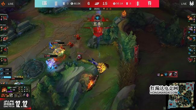 烈娜塔在野区碰见赛娜,直接闪现突脸接铁腕竞合,把赛娜也吓出了闪现,但烈娜塔身后其实并没有能跟伤害的队友,这波虚张声势为接下来V5下路越塔做出了铺垫,在波比的包夹之下赛娜无奈送掉了一血。V5的阵容极度依赖前中期优势,缺乏后期的输出保障,EDG深知这一点,因此在前期各线的防守上都做的非常严密,不愿给V5任何扩大优势的机会,猪妹还抓到了纳尔的一波失误完成了对位单杀。V5承担着较大进攻压力也打的有条不紊,没有出现急躁冒进的情况,而是稳健控制资源以及推塔,牢牢把节奏掌握在手中。