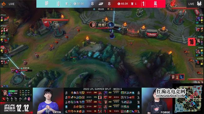 中期AL抱团rush掉了火龙,晚来一步的UP摸进AL的蓝buff野区,盲僧大招踢飞乌鸦,然后摸眼规避了皎月的大招,大纳尔拍晕了乌鸦后两队众人赶来参团,由于皎月没有了大招,加上乌鸦的蓝量见底,UP的持续战力稳占上风,打出2换4抢到了节奏主动权。26分钟UP抢占了小龙河道,Forge的乌鸦在拉扯的过程中先手E技能拉中了Elk的霞,并逼出霞的大招,随后纳尔把乌鸦和贾克斯拍到了霞的脸上,AL得以打出2换4,“听牌”了火龙魂大获全胜!UP对于后续团战的处理相当粗糙,双C接连失误导致AL收下大龙,最终AL虐泉1换4结束比赛,有惊无险2-0击败UP!