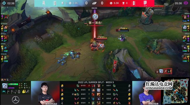 选出“卢娜”组合的AL下路自然成为UP前期的gank重心,H4cker的盲僧也在5分钟抓下得手:ShiauC的泰坦在草丛中先手出Q,精准地于小兵丛中钩到卢锡安,虽然娜美挡了后续伤害,但盲僧闪现Q中卢锡安,一发“奥特飞踢”拿到一血~