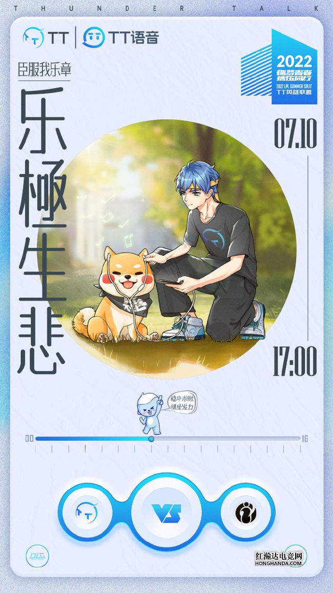 TT的海报标题是“臣服我乐章,乐極生悲”,TT蓝发少年正在给iG的吉祥物小柴犬戴着耳机听音乐,小柴犬正听得起劲儿,孰不知蓝发少年准备悄咪咪地拔掉耳机。TT在上一局虽然没有上主力下路“南芙”组合,但却2-1掀翻了纸面实力更强的BLG,期待这套阵容今天的精彩发挥!