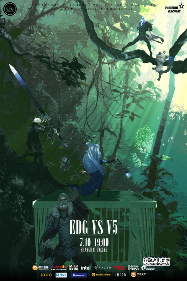EDG的海报标题是“无情猎手,致命一击!”,S11冠军皮肤五人众埋伏在丛林之中,知道V5的小黑豹一定会从此经过,即将打出致命一击!EDG在上一场1-2不敌OMG,低迷的状态再次引发了“淀粉”的担忧,今晚骑士团必将全力找回往昔荣光。