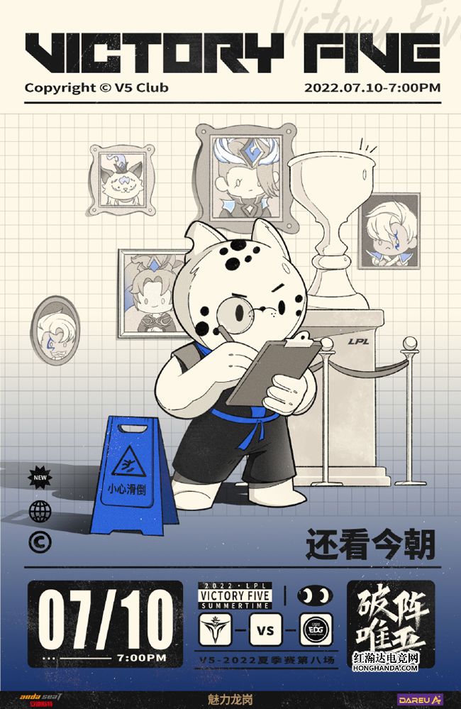 V5的海报标题为“还看今朝”,小黑豹“丛林巡查官”的身份已经成为过去时,如今的黑豹摇身变为博物馆讲解员,正在EDG的S11荣誉馆内做例行检查。7连胜稳居榜首的V5是LPL夏季赛中唯一保持着不败金身的队伍,今晚究竟是EDG终结V5的连胜之路,还是V5解锁8连胜呢?让我们拭目以待!