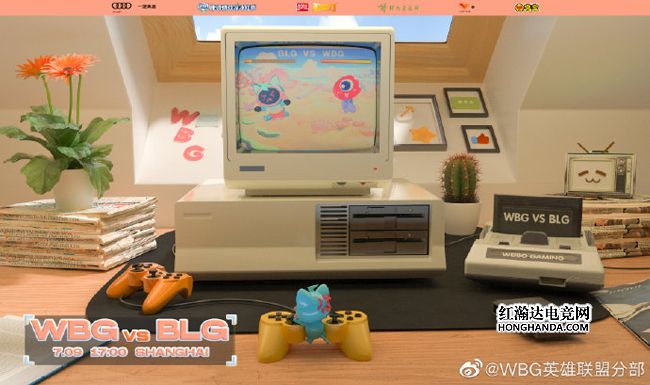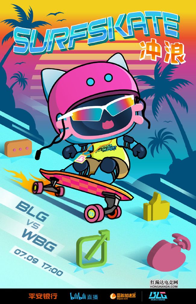 BLG的海报标题是“冲浪”,吉祥物“电视喵”脚踏滑板,从山上一跃而下,翻过地面上WBG“大眼仔”轮廓的障碍就能抵达终点。BLG在夏季赛的状态起伏不定,目前积分2-5排名第13,今天的首发中野是FoFo加新人小将can,希望他们能顶住压力证明自己。