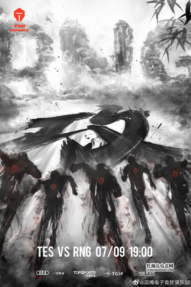 TES的海报标题“攻”,画风和今天的LPL“国风日”主题不谋而合,水墨风的TES五虎冲向了远处的RNG,地面上巨大的“攻”字明示今晚TES将以招牌团战拿下RNG。排名第三的TES豪取六连胜士气如虹,今晚不知他们能否一雪今年的LPL春决前耻,复仇击败RNG呢?