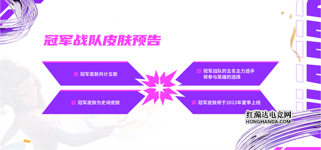 官方还将推出手游专属冠军战队皮肤,以纪念冠军战队的光荣胜利。本次夺冠的NV战队里的五位主力选手将参与英雄的选择,并预计在来年夏季推出五款史诗级的冠军皮肤。