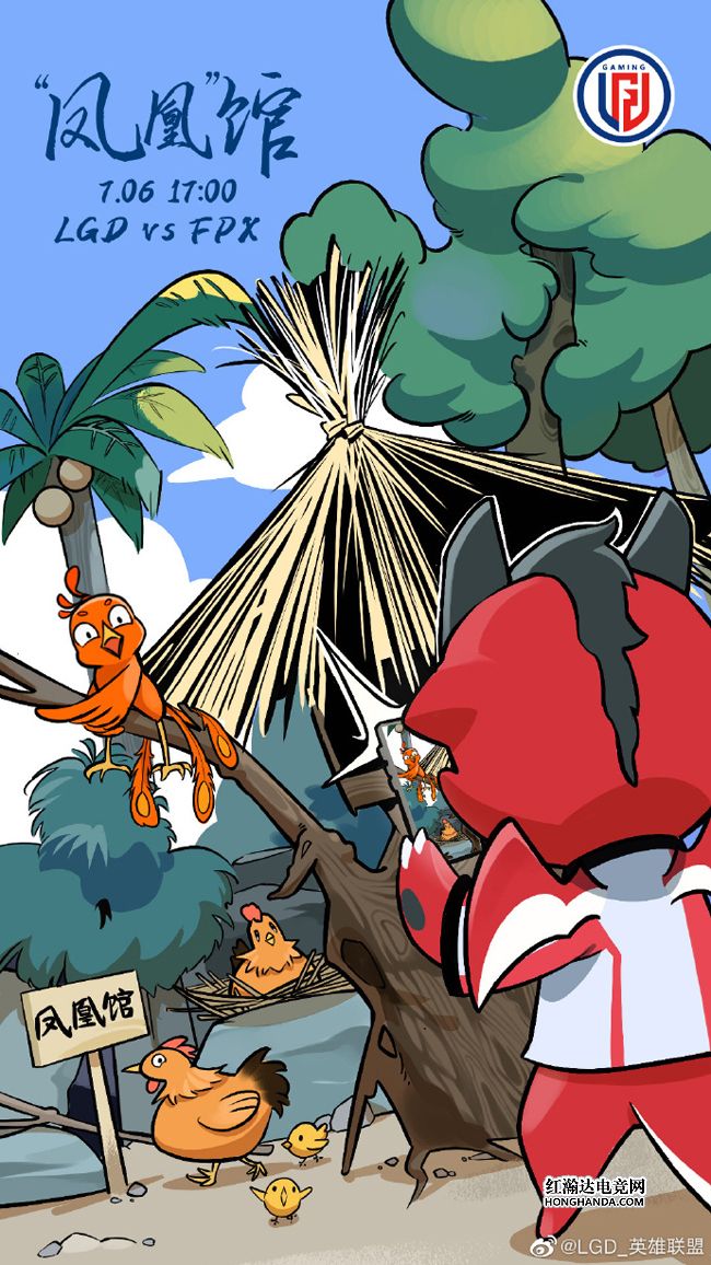 LGD的海报标题为“‘凤凰’馆”,LGD吉祥物小红龙继续着自己的杭州动物园之旅,这次小红龙来到了“凤凰馆”,结果馆里展示的并不是凤凰,而是家禽鸡和FPX的三毛小火鸡,看来这个“凤凰馆”名不副实。这个赛季的LGD依旧是“黑暗四天王”的一员,已经2连败的他们何时才能找到获胜之道呢?