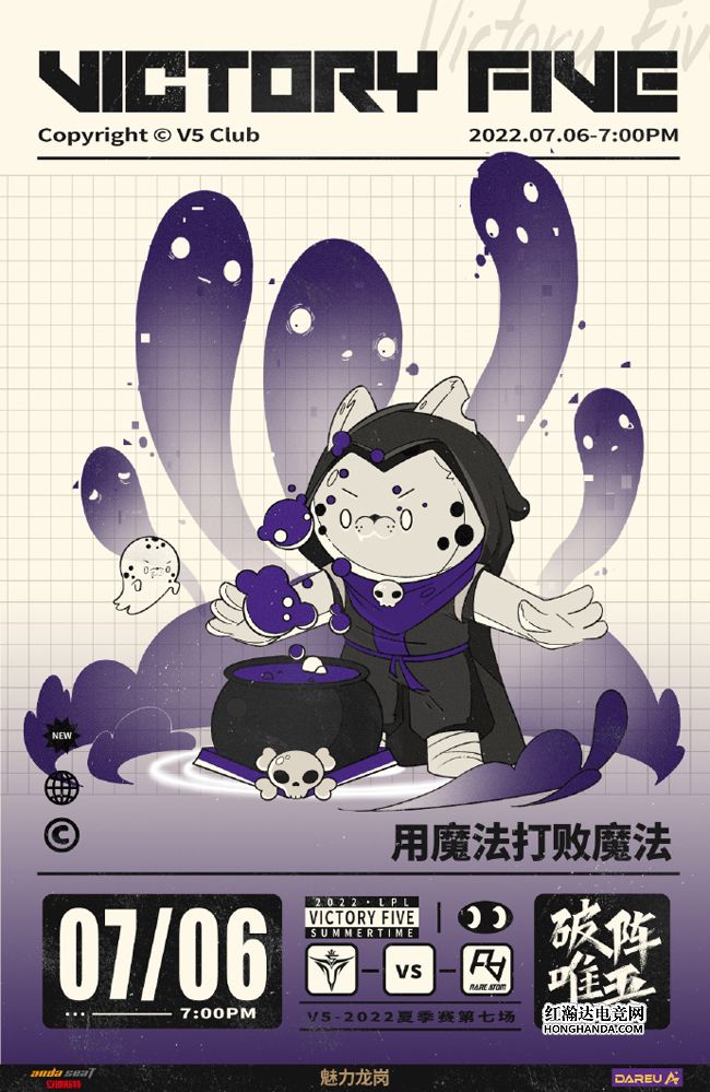 V5的海报标题是“用魔法打败魔法”,V5的吉祥物小黑豹化身魔法师,准备和RA的稀有原子“小恶魔”来一场正面对决!千呼万唤始出来,V5在春季赛的主力中单Rookie终于结束了隔离,将在今晚搭档XLB登场,这也是Rookie的夏季赛首秀,期待他的精彩发挥!
