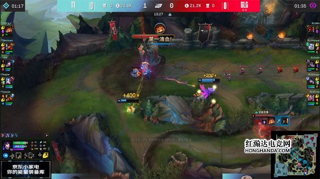 由于TT主力下路Puff突发面部神经炎,因此缺席了本场比赛,替补AD选手Kepler和辅助yaoyao登场。前期双方三线和平发育,BLG稳健地放掉了峡谷先锋,转而控下风龙。TT则把先锋放在中路,让阿狸吃到BLG一塔的镀层。