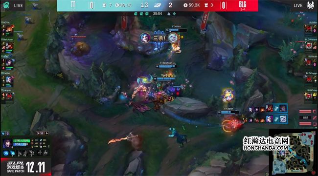 TT经济领先3千丝毫不慌,更是抢到一条水龙,打断了BLG的龙魂“听牌”节奏。TT抱团推掉上路一塔,然后进入大龙河道做视野,发现了落单的佛耶戈,Weiwei的佛耶戈闪现撞墙无奈阵亡。TT转身果断开大龙,塞拉斯下龙坑没有抢到只能“白给”,TT拿到塞拉斯的人头并全身而退!BLG的中、下两路二塔告破,在河道和自家野区的视野极度匮乏,TT得以兵不血刃控下水龙。28分钟TT在BLG的红buff野区抓死了探视野的洛,rush掉大龙后扬长而去。BLG中路水晶失守,经济落后7千。最终TT在野区打出1换5团灭BLG,步步为营1-0先下一城!