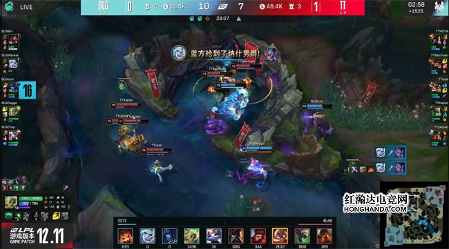 比赛前期巨魔的控图节奏优于盲僧,BLG插在TT野区的真眼发现了打蓝buff的盲僧,BLG下路组得以掩护巨魔控下海克斯小龙。7分钟双方打野同时gank边线:纳尔遭到TT上野的越塔送了一血,巨魔gank下路时和金克丝互换倒地。