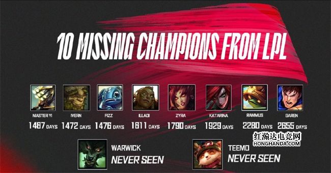 LPL官方推特发文:时隔2528天,希瓦娜回到了LPL的赛场上,布兰德和内瑟斯也时隔2506和3211天回归了,以下是许久没有登场的英雄(狼人和提莫还从未登场过):