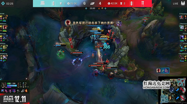 23分钟的海克斯龙魂团战原本TT是更占优势的一方,他们在中路抱团准备向JDG施压,却没想到冰女从河道草丛找到了完美的进场位置冰霜之环控到四人,JDG跟进输出斩杀TT双C以后拿下小龙。格温趁着JDG推进中路二塔的时机TP绕后想要开团却因伤害不足被JDG集火击杀,TT其他队员根本跟不上任何输出,JDG趁机将大龙击杀,TT众人还想过来阻挠结果被JDG反手开团击溃,复活出来接应队友撤退的格温再次成了倒霉蛋遭到击杀。