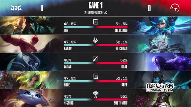 蔚Gank下路未果以后想要去JDG野区反蓝,结果被视野发现遭遇冰女和佛耶戈的包夹送出一血。JDG在无力争夺下半区资源的情况下早早把双人组换到了上路并且拿到了峡谷先锋,TT在前期的进攻变得非常活跃,频频找到JDG上中野的失误完成击杀,把主动权掌握在了手中。JDG一直没有组织起有效的反击,而是一直采取避战发育的策略,让TT在16分钟左右又拿到了三条小龙。TT在中路尝试越塔集火泽丽没有得手,蔚跟上大招终于帮助队友击杀了猪妹。