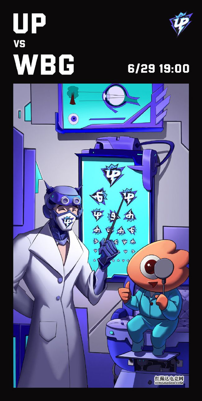 UP的海报标题为“好眼力”,戴着UP口罩的眼科医生正在为WBG吉祥物“大眼仔”测视力,可惜大眼仔只能看清视力表第二行较大的UP队标,视力真的很“好”~2胜2负的UP排名第9,和WBG相差不远,今晚Zoom和TheShy的上路交手是一大看点,让我们拭目以待!
