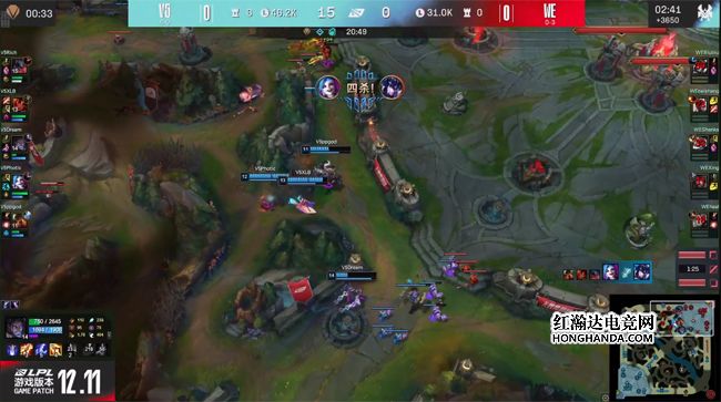 Rich的纳尔从下路转中时,在WE的蓝buff野区遭遇前后包夹,临死前极限的“如来神掌”拍晕三人,泽丽R闪进场配合队友打出2换5团灭WE,双方经济差来到8千。中期WE为防守下路二塔,组织了一波全员包夹攻势,丽桑卓传送绕后先手开团,可是WE双C的伤害严重不足,V5反打出0换3,无压力将大龙收入囊中!WE付出上、下路三人的代价才终结了泽丽,V5则连破中、下两路水晶,经济领先来到1万4。最终V5平推中路虐泉0换4一波结束比赛,2-0碾压WE豪取5连胜!