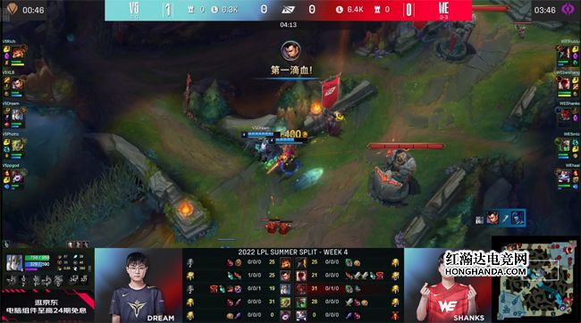 经此一役WE的节奏彻底哑火,三线全面被压制,上、中路一塔接连告破。大龙出生前V5掩护第二只峡谷先锋连撞四头,通关了WE中路水晶,双方的经济差来到1万。WE面临中路超级兵线的压力,尝试在上路强抓金克丝,盲僧刚刚摸眼出塔就被融化,WE中野双双倒地。20分钟V5抱团开大龙,WE晚来一步没有抢到,Photic的金克丝一路追击怒砍四杀,V5打出0换5直捣黄龙,中辅甚至进入水泉欢乐“送人头”。beishang的盲僧摸眼R闪把金克丝踢进水泉,为WE拿到本场唯一的人头,V5完美运营1-0先下一城!