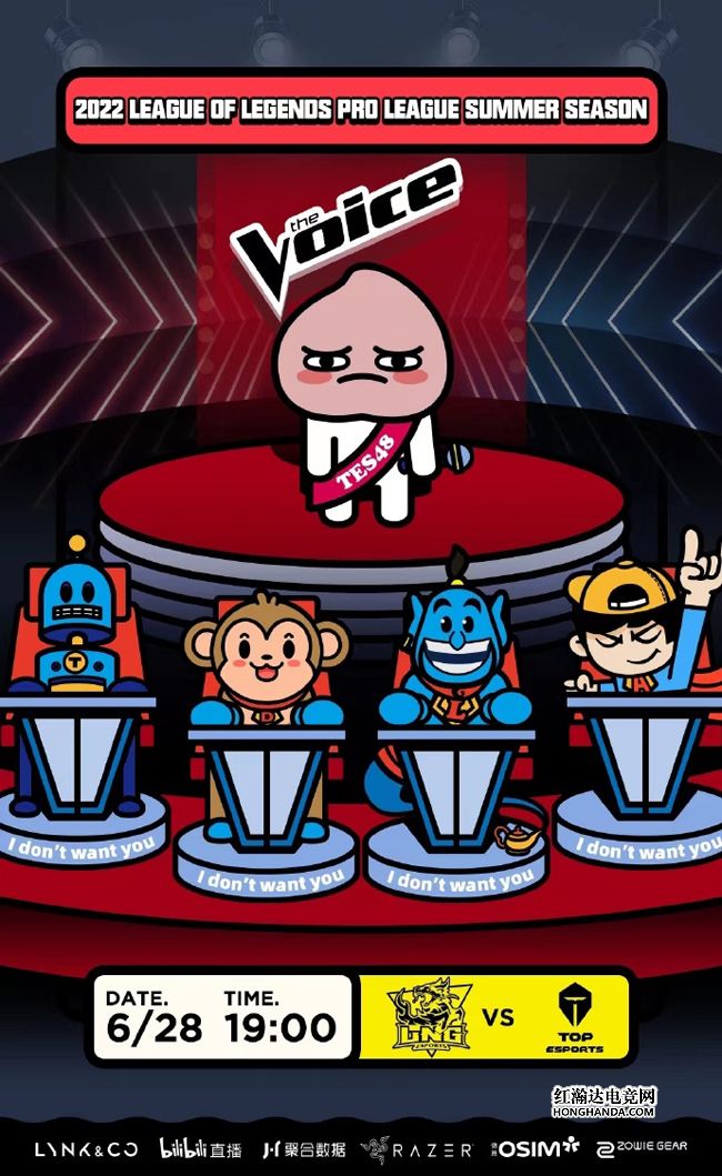 LNG的海报标题是“无人Pick”,海报借鉴了曾经大火的综艺《中国好声音》,包括“金咕咕”在内的LNG四位评委并没有为“TES48优秀毕业生”水蜜桃转身,TES只能惨遭淘汰。LNG在上一场爆冷1-2不敌OMG,只有Doinb的发挥在线,其他四人都让粉丝们大失所望,本场的首发辅助换为Iwandy,小廖能否扫除队伍的颓势呢?