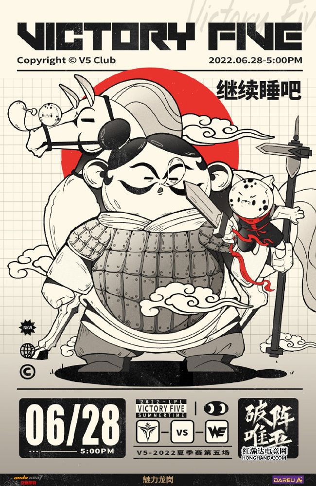 V5的海报标题是“继续睡吧”,吉祥物小黑豹一跃登上了WE主场西安的兵俑雕像,不过兵俑和马佣雕像都打起了瞌睡,硕大的鼻涕泡表明WE早已陷入深度睡眠,黑豹V5可以轻松地将其打倒。四连胜的V5状态火热,本场的首发打野换为XLB,期待他的精彩发挥!