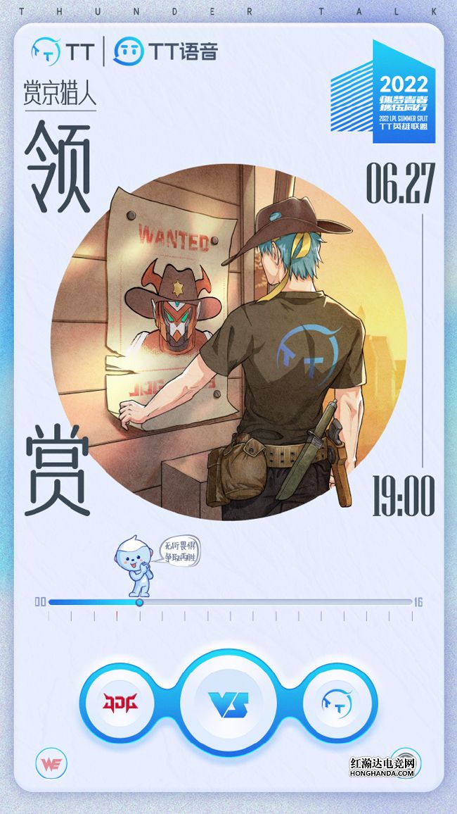 TT的海报标题为“赏‘京’猎人·领赏”,海报同JDG的海报进行了隔空联动,TT蓝发少年也转职成为赏金猎人,发现了JDG机甲武士的通缉令,准备将其抓拿归案,以便领取丰厚的赏金~虽然TT在上一场从排名垫底的WE手中拿到了赛季首胜,但JDG的实力之强劲有目共睹,TT能否在今晚打出“爆冷局”呢?让我们拭目以待!