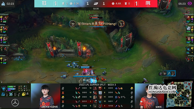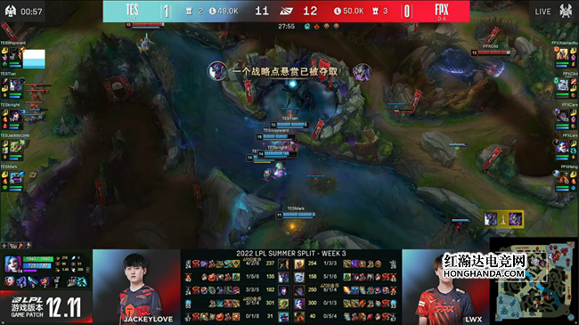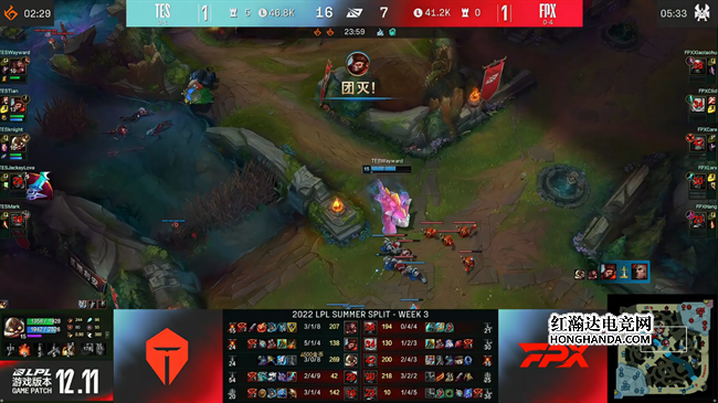2022 LPL夏季赛常规赛第三周第六天,TES战队对阵FPX,近期状态火热的TES战队在第一局带来了近乎完美的进攻运营轻松取胜,但是他们在第二局由于上半区前期陷入劣势被FPX滚起雪球,进行了非常顽强的抵抗以后还是遗憾落败。最终在决胜局里TES从小龙团战撕开突破口,势如破竹拿下最后的胜利!